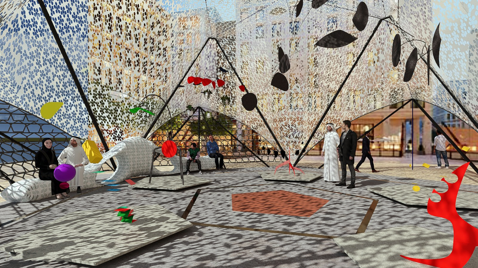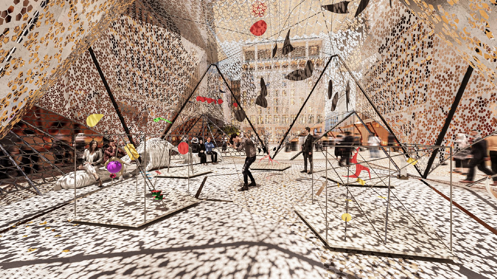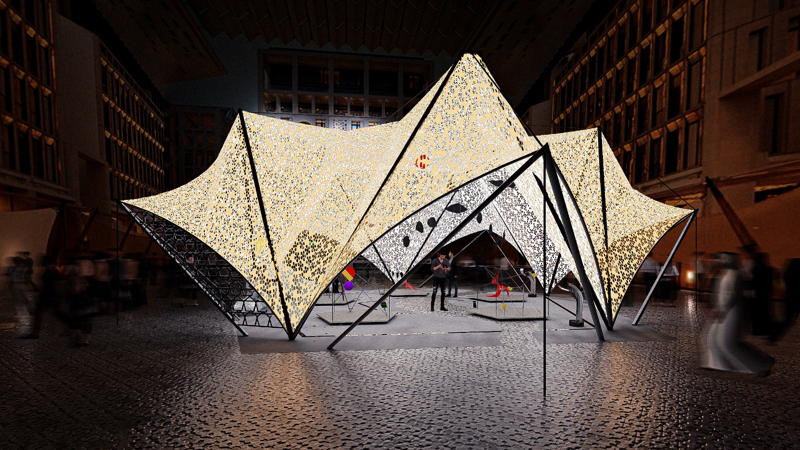 The pavilion’s internal lighting system integrates micro-LEDs within the perforated membrane, creating a soft, diffused glow. Controlled by smart sensors, it adapts in real time to environmental light conditions modulating intensity and tone. This ensures minimal energy consumption while offering an immersive, dynamic and evocative experience, transforming it into a luminous beacon in the night.