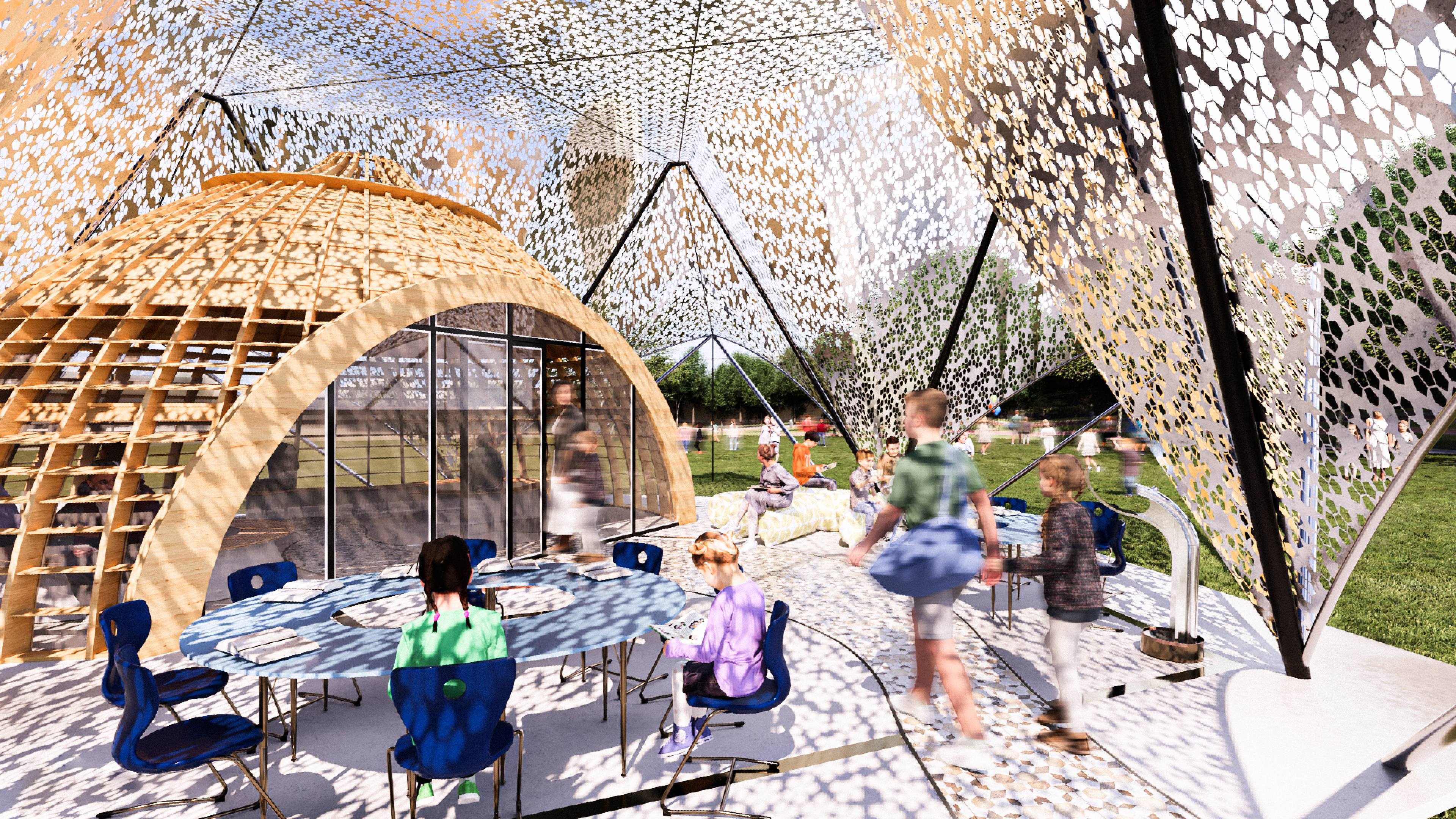 Amid lush greenery, this pavilion offers a tactile creative lab and an innovative bee-therapy system. The harmonic vibrations of the hives and the purified beehive air promote relaxation and sensory balance, with special attention to the wellbeing of neurodivergent children